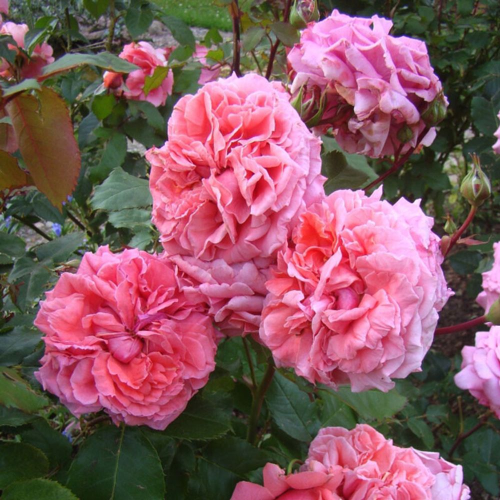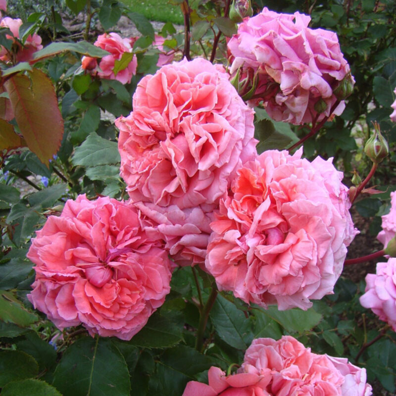 Цветки красные с оранжевым оттенком,с более тёмным центром, с умеренным ароматом, махровые более 40 лепестков.Отцветая, крайние лепестки светлеют. Цветение в кистях, бутон раскрывается медленно. Светло зелёная, матовая листва, отличная устойчивость к болезням, обильное цветение весь сезон.