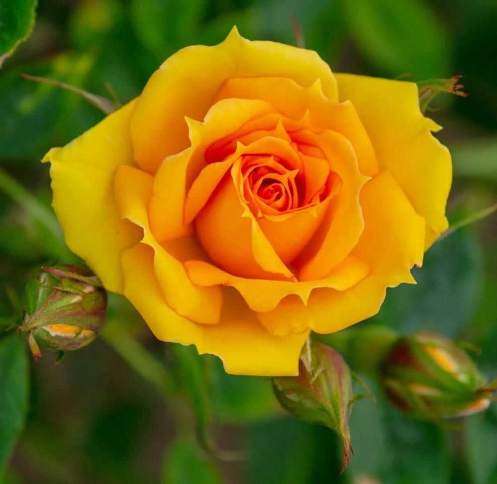 Роза имеет слабо выраженный аромат, но цвет бутона и распустившегося цветка полностью это компенсирует. Жгучий ярко-желтый цвет лепестков, напоминает солнце. Классическая форма чайно-гибридной розы с высоким центром, на побегах в основном одиночные цветки. В раскрывшемся состоянии края лепестков имеют тонкую оранжевую полоску. Лепестки с четко очерченными краями, как-будто резные, плотные. Необыкновенно яркий желтый цвет при интенсивном солнечном свете выгорает до лимонного. Куст высокий, вертикальный, идеально подходят для срезки. Колючесть средняя. Листва темно-зеленая, блестящая, выгодно подчеркивает цветок.