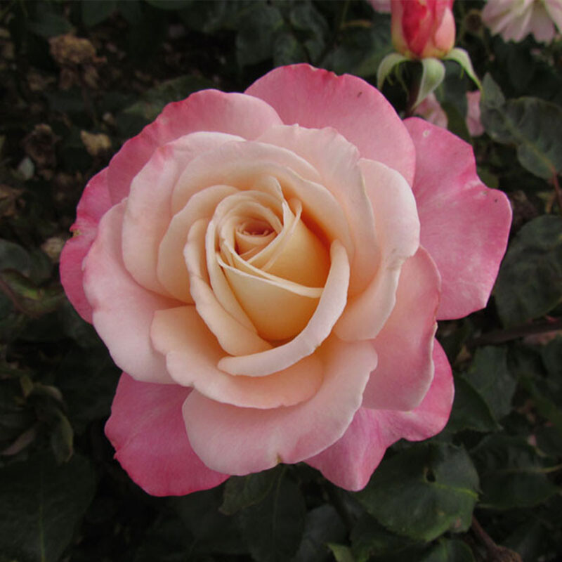 Чайно-гибридная роза с классическим цветком. Аромат сильный. Цвет лилово- розовый со светлой серединой. Листва крупная, темная, плотная- устойчива к заболеваниям.
