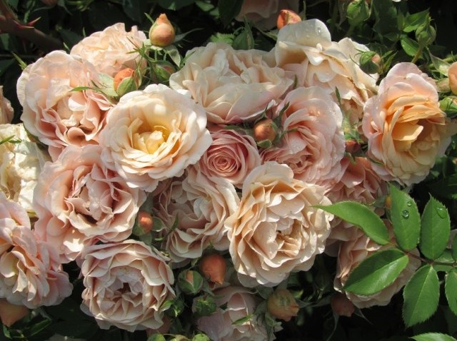 Цветет волнами в течение всего сезона. Цветовая гамма сочетает в себе очень нежные оттенки нескольких цветов: абрикосовый, персиковый, кремовый. Цветок среднего размера, каждая роза раскрывается до 6-8 см в диаметре. Цветет действительно зонтиком, то есть, большими кистями. Умеренный, аромат розы.