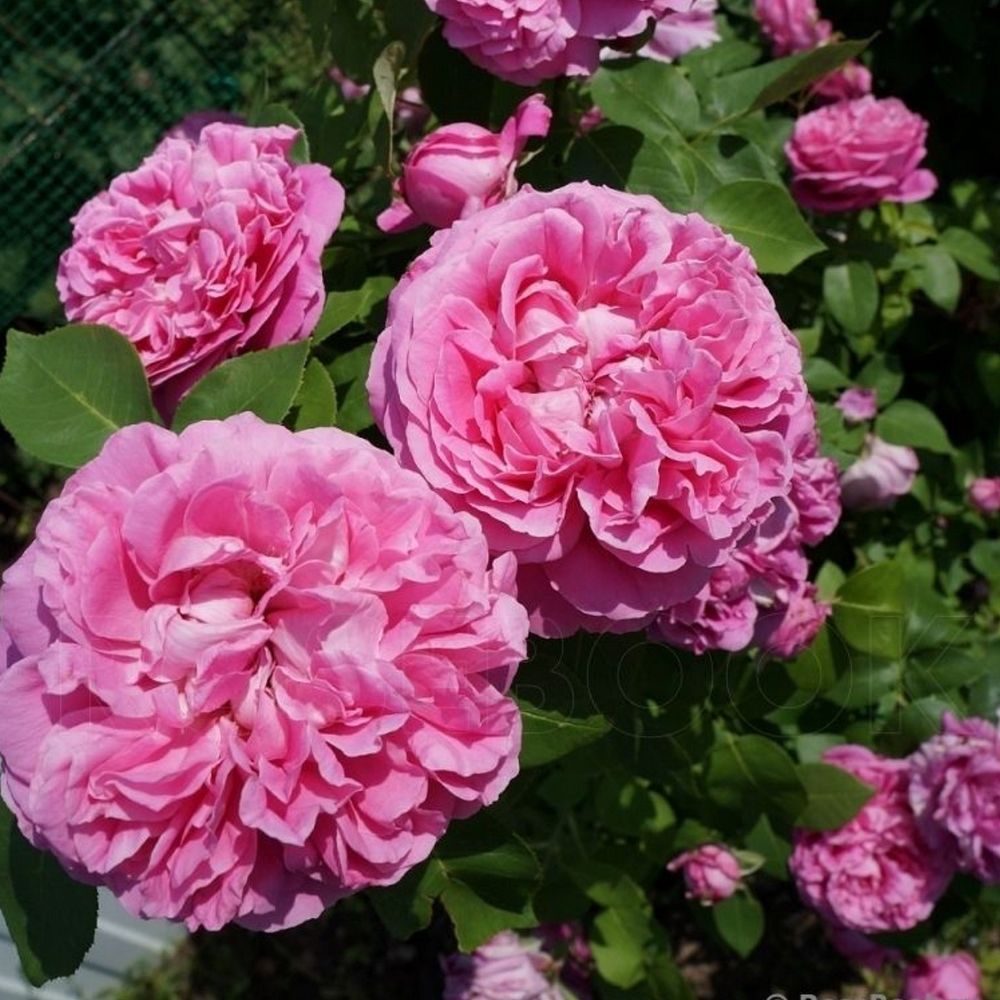 Цветки густо-розовые, с сиреневым отливом и серебристой оборотной стороной лепестков. Шаровидные бутоны раскрываются в огромные чашевидные цветки, густомахровые, с волнистыми лепестками, как пионы. Цветки крепко держатся на сильных побегах, не поникают, появляются обычно по одному, иногда по 2-3 шт. Крупная, матовая зеленая листва. Этому сильнорослому сорту нужно много места. Подойдет для заднего плана миксбордера.