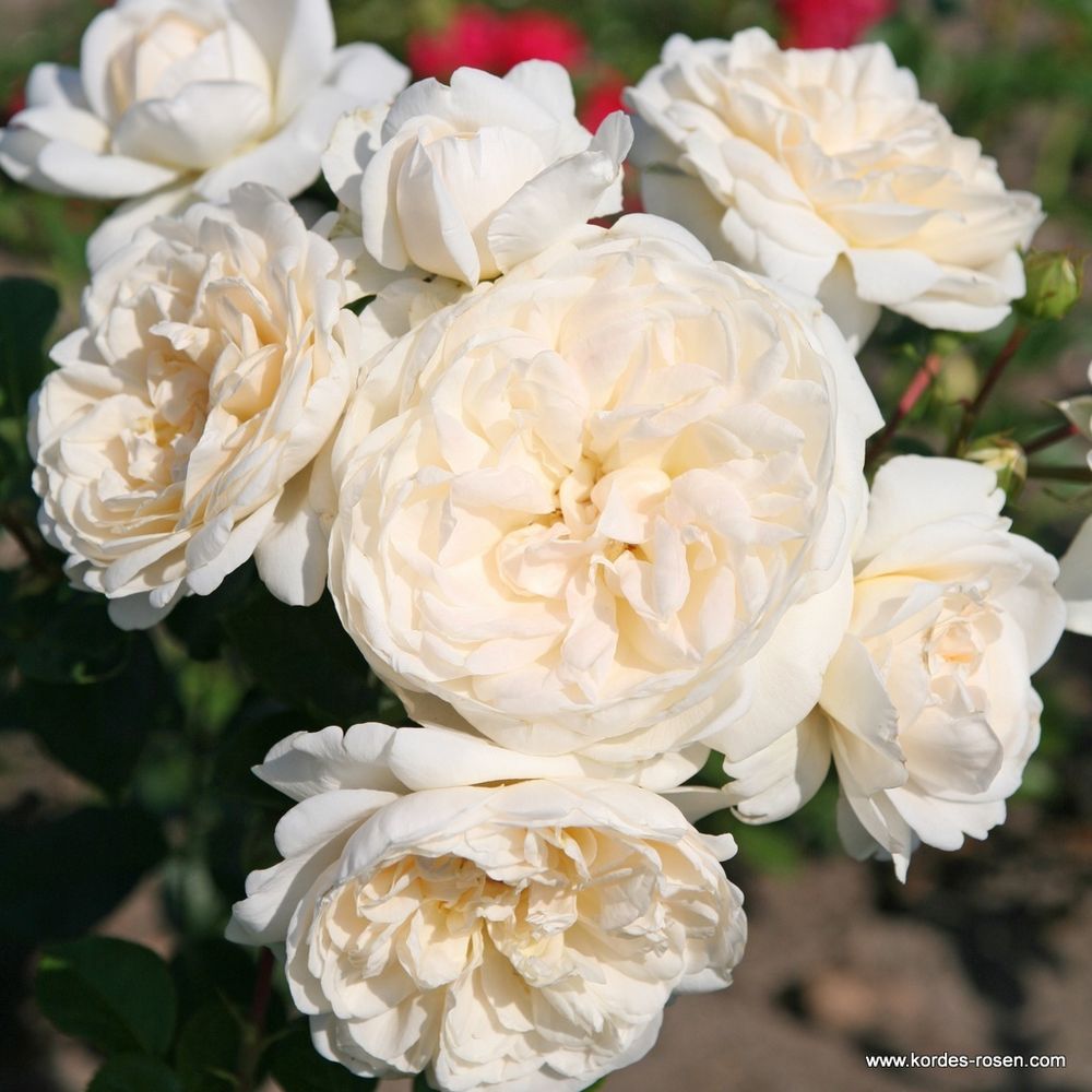 Сливочно - белые цветки, с желтыми оттенками, со штрихами светло-розового. Мягкий аромат. От 80 до 90 лепестков. Большие, очень плотные цветки в небольших срцветиях, старомодной формы. Бутоны: длинные, заостренные.
