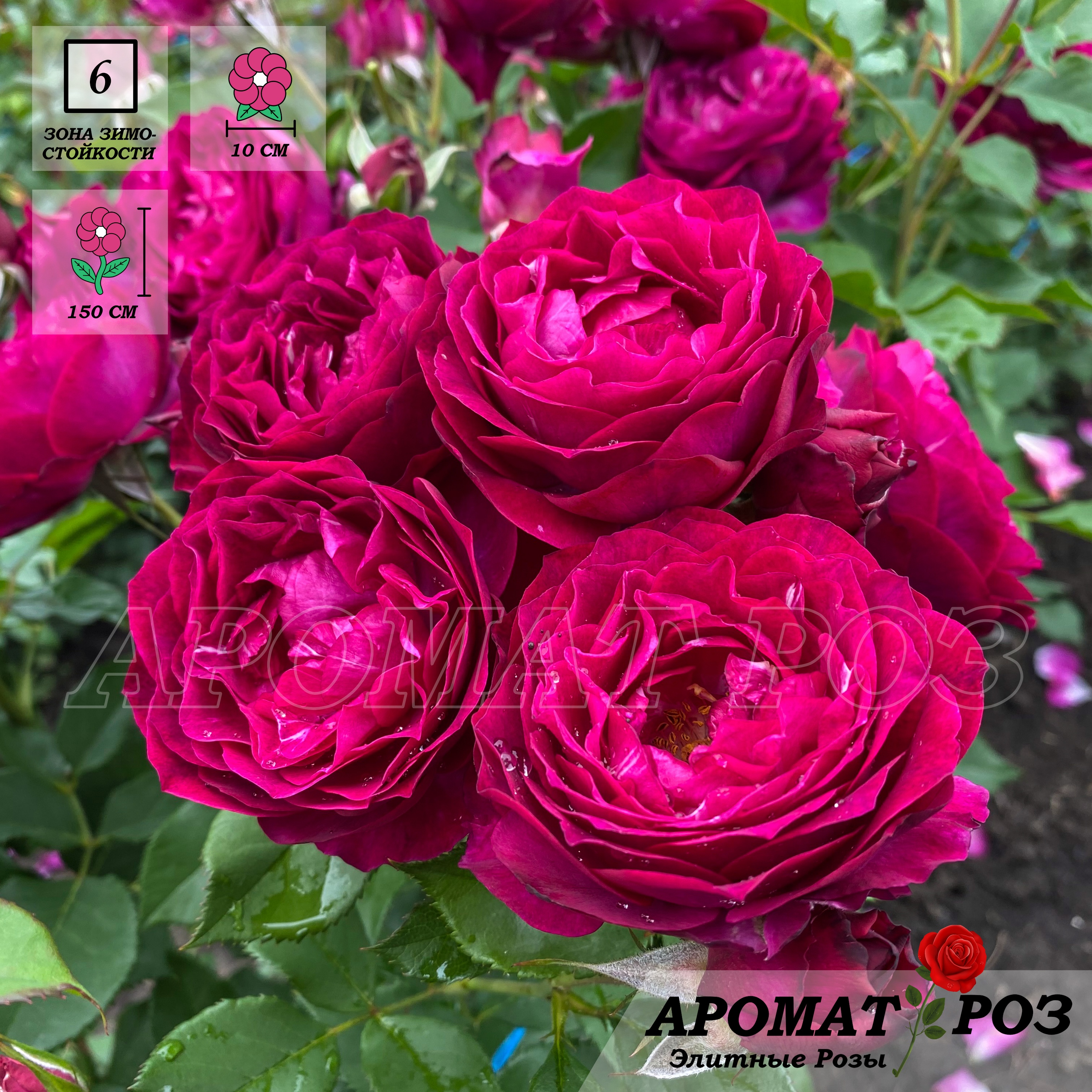 Роза в новом, «диком» стиле. Цветки по форме напоминают камелии. Это первая роза в сиреневых тонах, получившая награду AARS за последние 20 лет. Кисти пурпурно-красных полумахровых цветков с волнистыми лепестками. Благодаря ярко-зеленой листве, это настоящая машина букетов. Аромат насыщенный, цитрусовый. В холодную погоду цвет темнее.