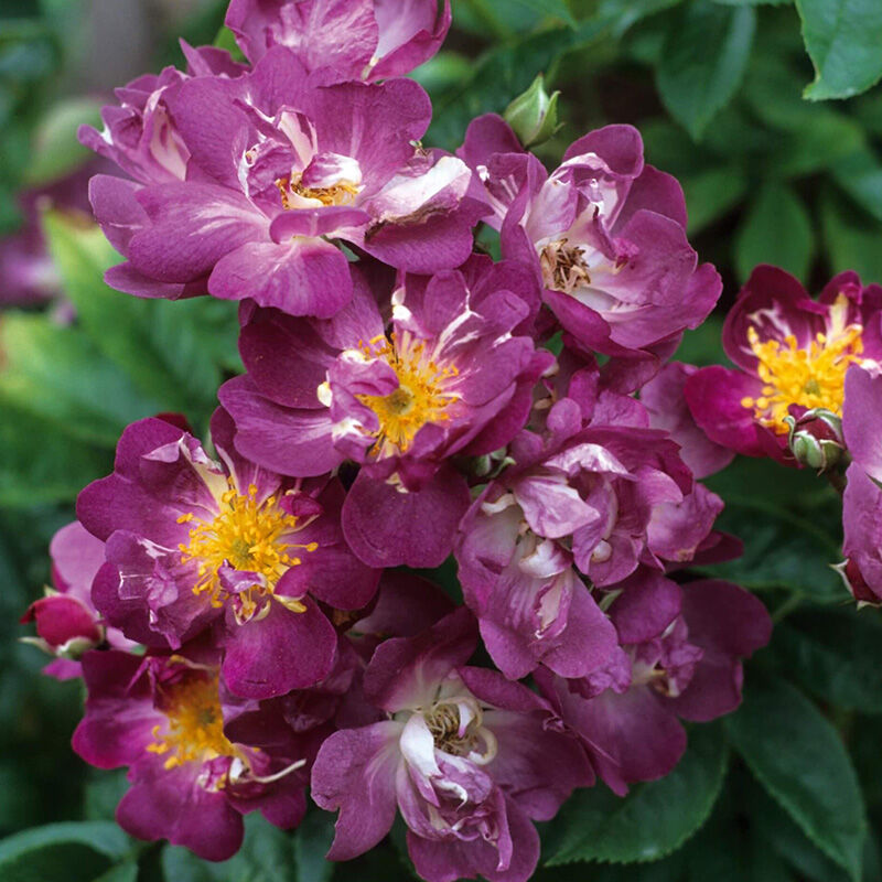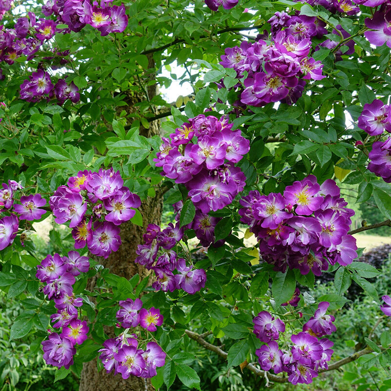 Veilchenblau самый известный и широко распространенный из пурпурных рамблеров. Цветки вначале красновато-пурпурные, затем теряют красный оттенок и становятся темно-сине-фиолетовыми, а перед самым увяданием - серо-лиловыми, особенно в жаркую погоду. Цветки держатся на растении долгое время, так что различные оттенки обычно присутствуют одновременно. У большинства цветков в центре широкие белые потеки. Появляются в кистях по 10-30 цветков, осенью могут появиться мелкие оранжевые плоды. Побеги толстые, без шипов. Куст сильнорослый, хорошо укореняется черенками (используется в качестве подвоя). Хорошо растет как в очень холодных, так и очень жарких условиях, теневынослив.